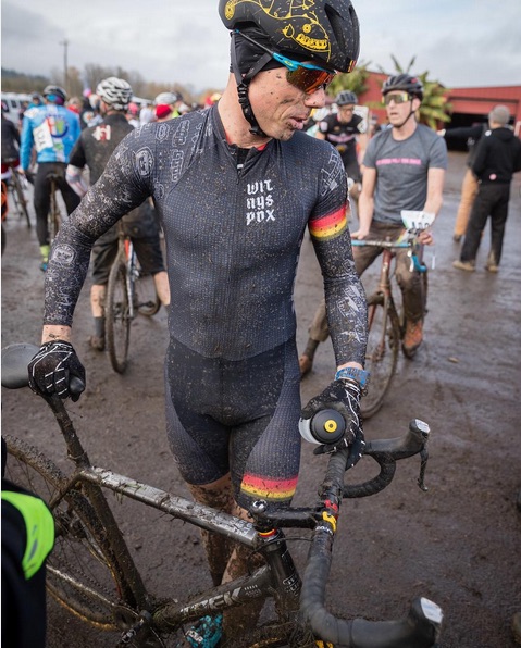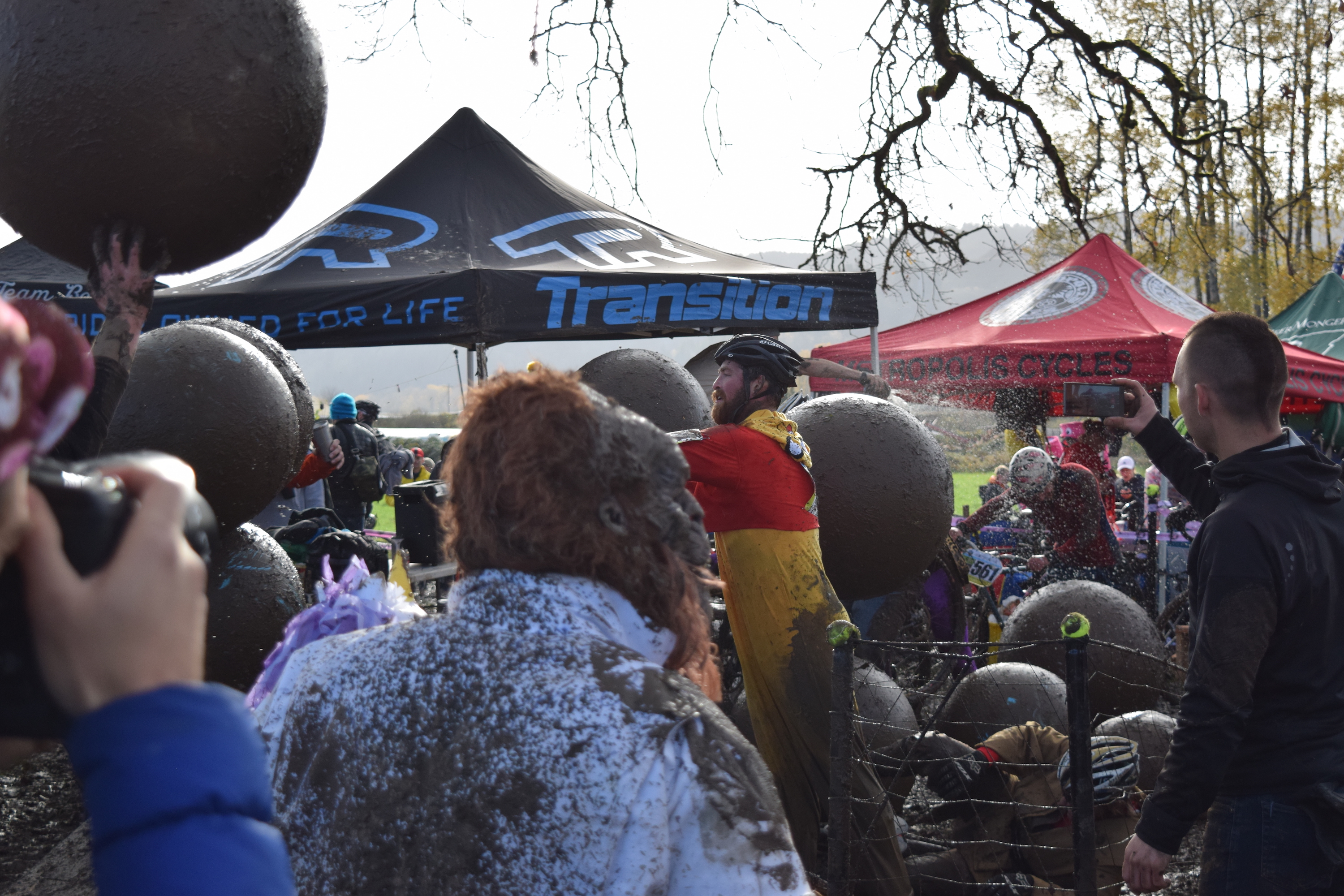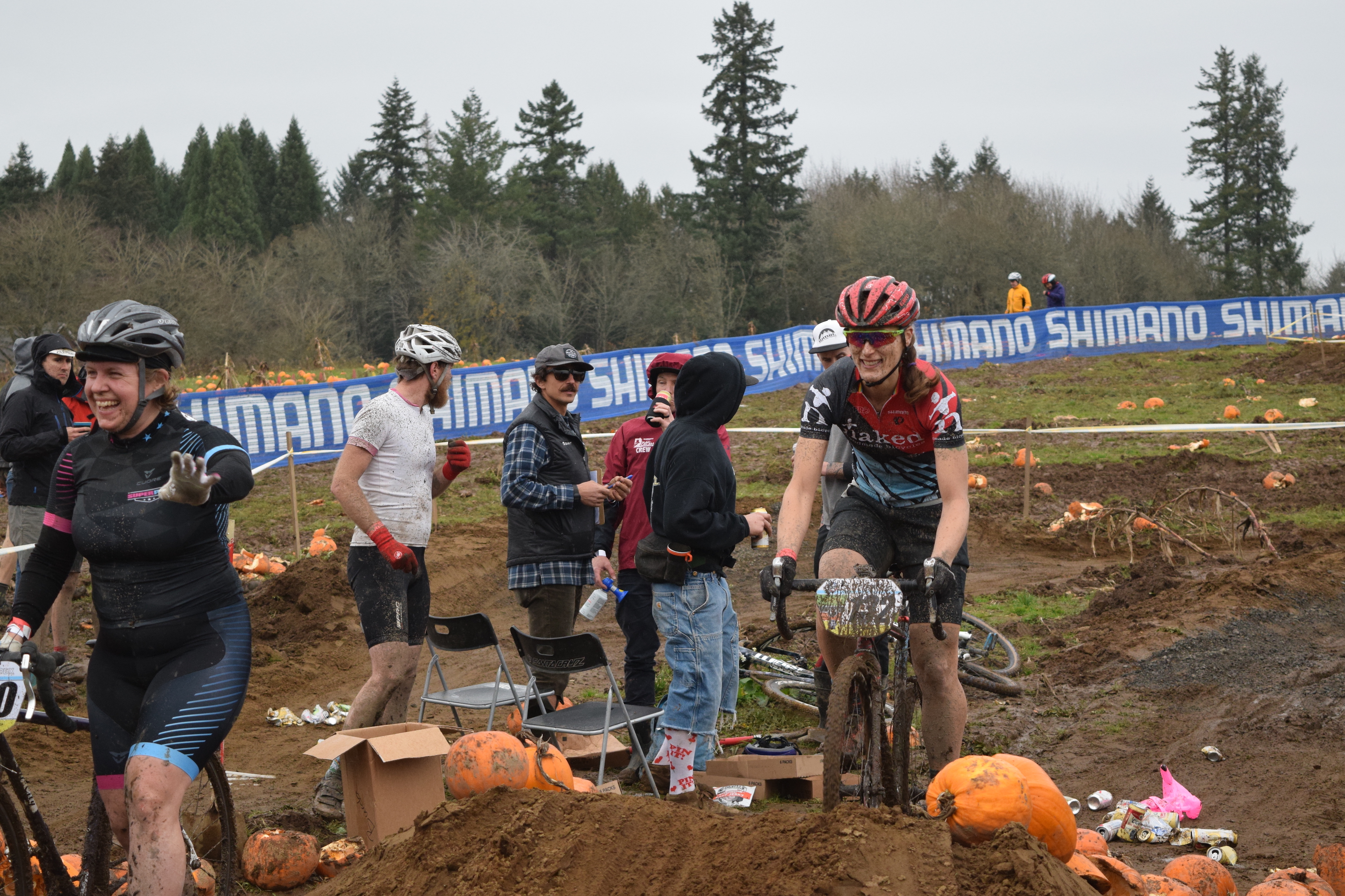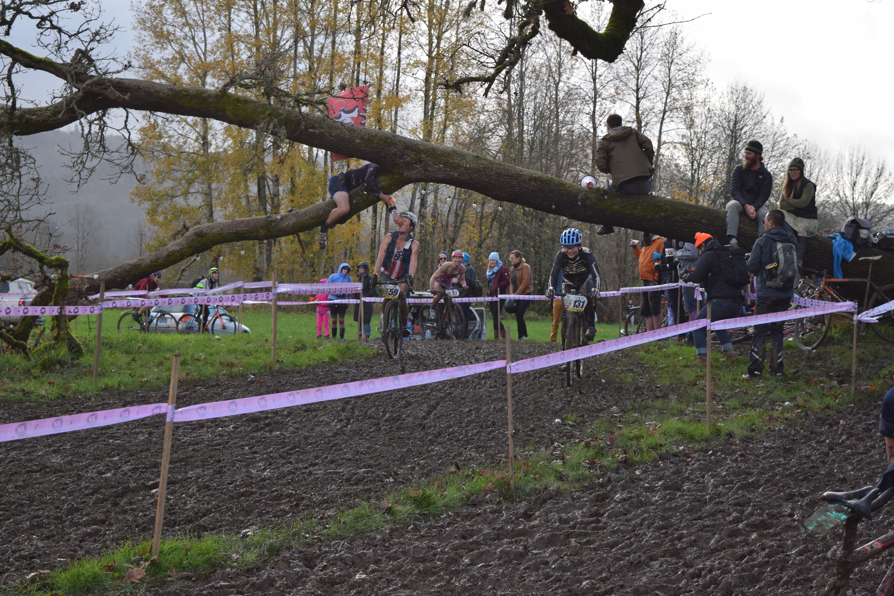 From here, things get fuzzy. In the Women’s championship race, Mical had a reptilian wardrobe malfunction, her mud-caked onesie drooping lower ever hap, which halted her march baack through the Women’s field and denying her the 4-peat and free ink. Her sister bike, Barney the CX-ausaur, suffered a similar fate, as Cam and Sylvia’s suuuuuuuper-cute Whinny the Pooh / Hunny costume proved equally adept at absorbing mud. I don’t think I saw Andreas all race, and I have only a vague memory of seeing Halldor, so I have no idea what happened to them. But I did see Danielle crushing her way around the course hot on the heels of the lead group. She eventually finished well within the top ten, proving that when it comes to muddy SSCX races, fashion IS function. At some point I was clotheslined by an actual clothes line, halting what little progress I was making around the course. The races ended, and we all retired to the parking lot to drink beer while watching people try escape the mud bog of a parking lot. This was possibly the most entertaining part of the day.